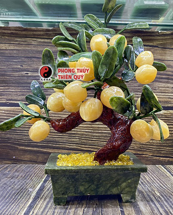 Cây đào ngọc hoàng long với những quả đào mang màu vàng rực rỡ được chế tác từ ngọc hoàng long tự nhiên, lá được chế tác từ ngọc serpentine. Mỗi chi tiết trên cây đều được chế tác tỉ mỉ bởi các nghệ nhân lành nghề, mang đến vẻ đẹp đầy sức sống.
